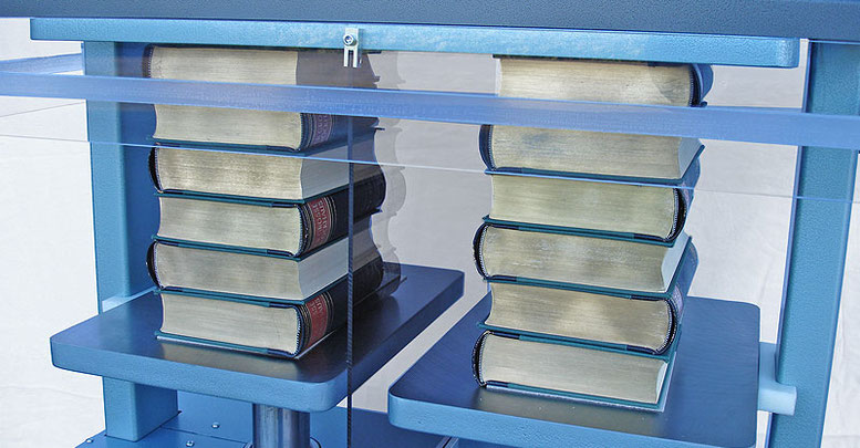 The hydraulic Twin Presses are suitable for pressing of books, brochures, posters, pictures, etc. The pressing operation of the pressure plates is controlled by hand levers. As soon as the desired pressure is reached, the hydraulic pump will stop automatically, and the pressure is kept on constant level. The pressure plates can be operated either single or together, and they can be stopped in any position.